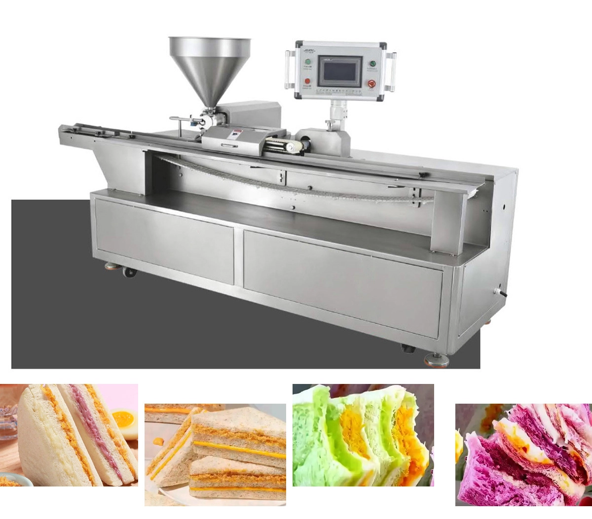 1. This industrial sandwich production machine is specially designed for toast sandwich making, integrating automatic filling injection and precise diagonal cutting into one streamlined process.
