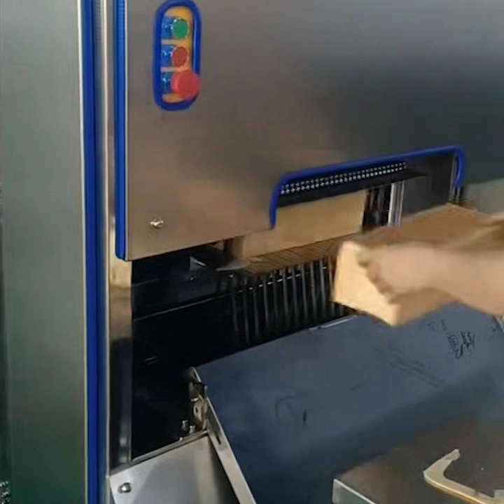 Answer: The slicing machine is equipped with imported high-quality band saw blades that are sharp, durable, and long-lasting for precise slicing.